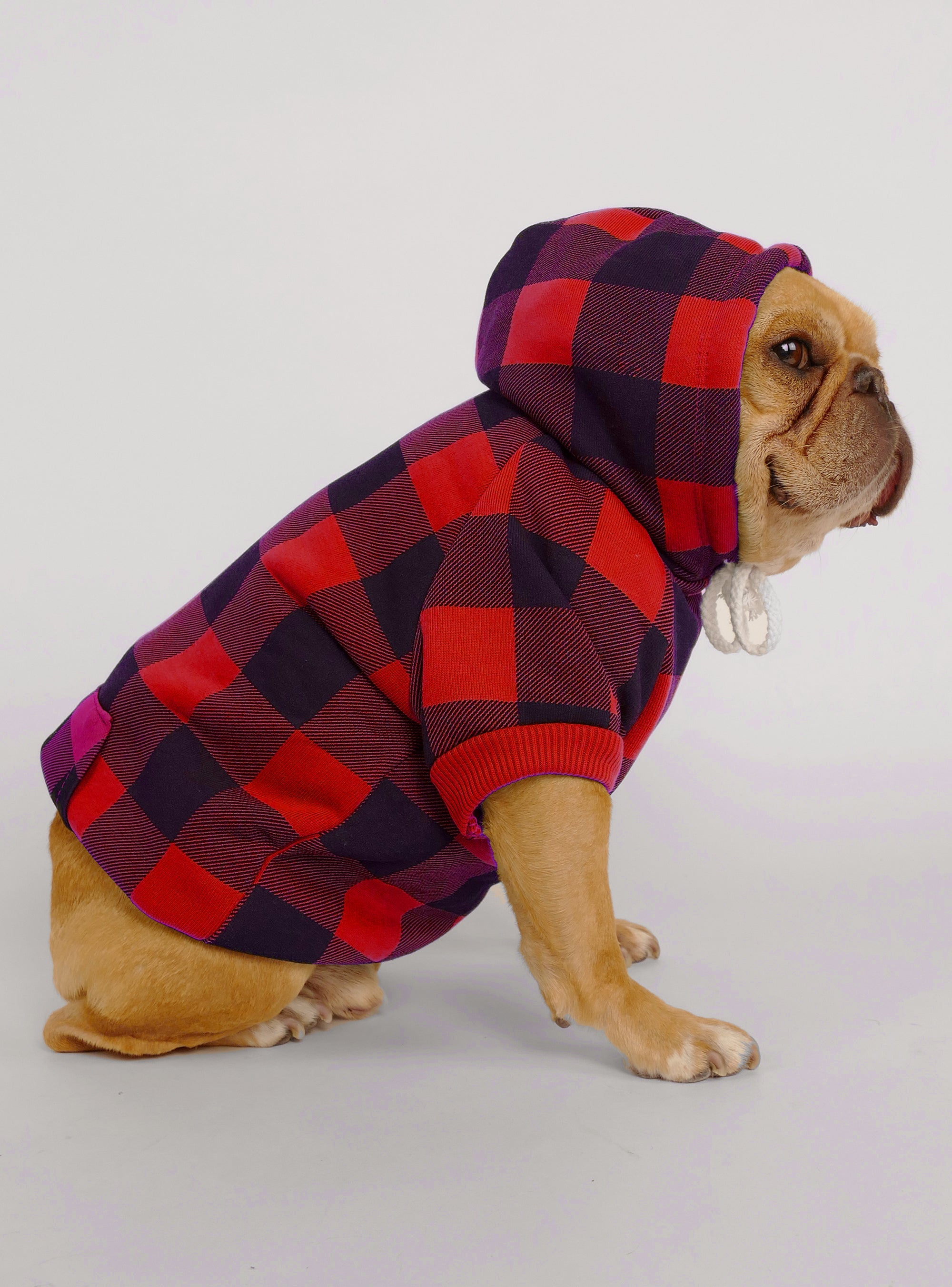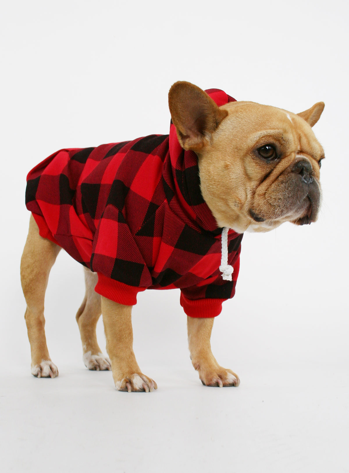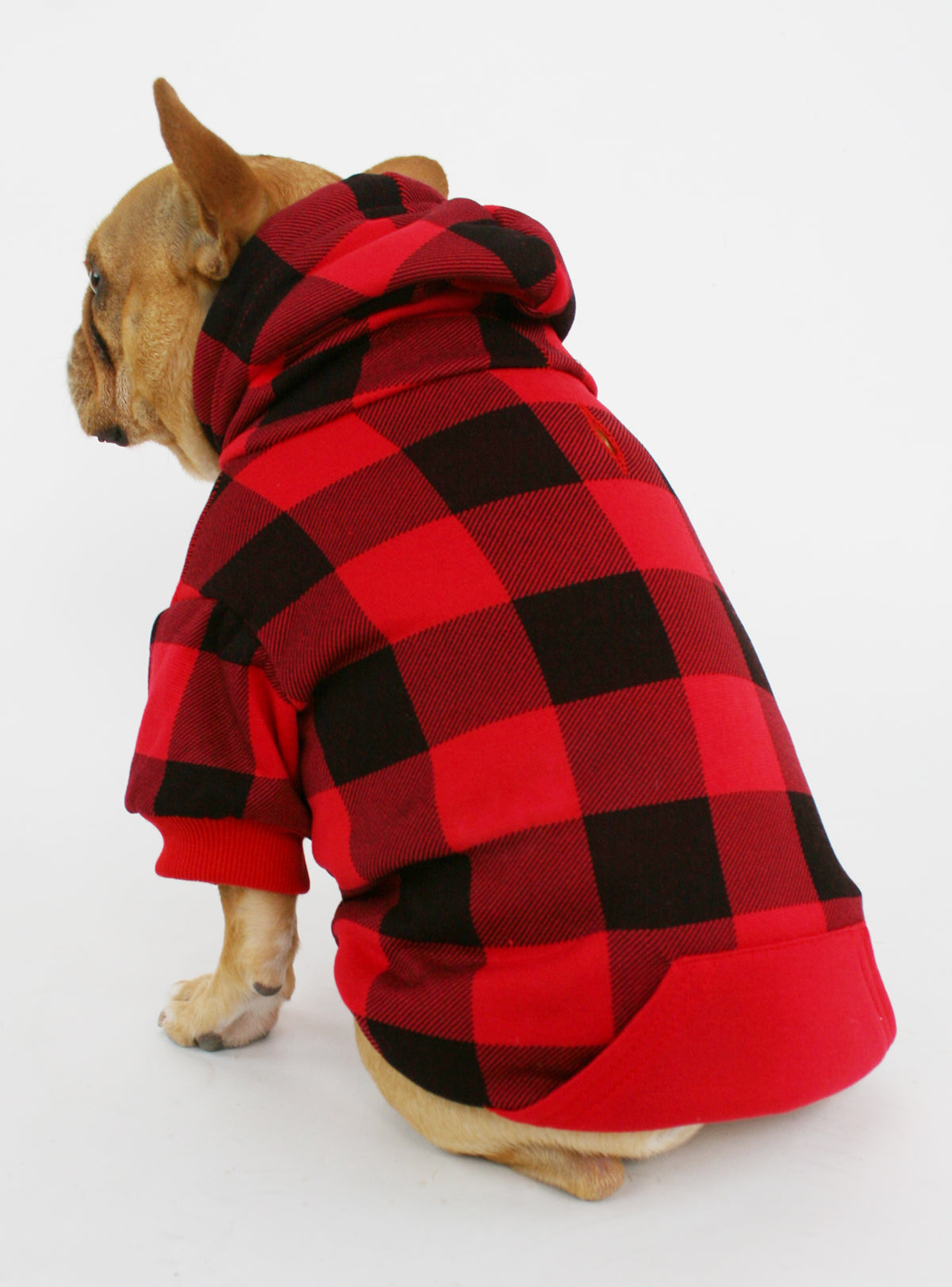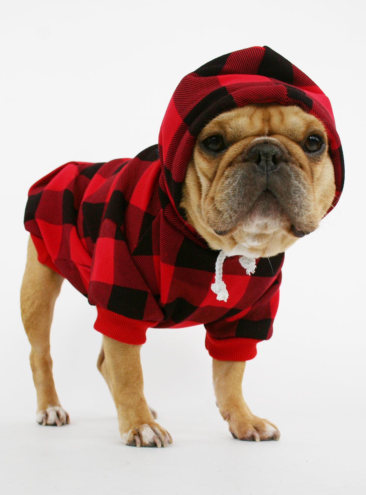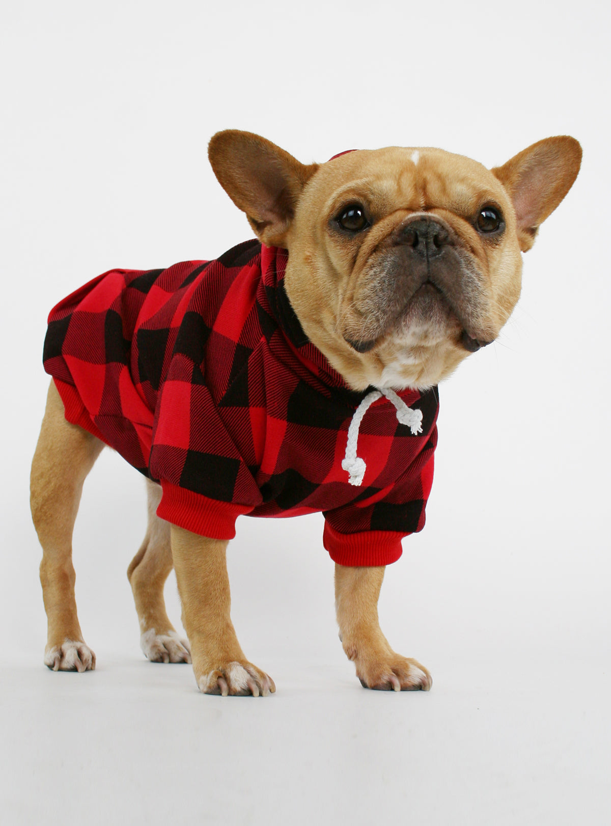 This dog hoodie features: Classic red and black plaid pattern, kangaroo pocket, hole on the back for easy leash access, machine washable, made of 65% cotton, 35% polyester. Huey (the model) has a chest measurement of 21″ and is wearing size Medium.
