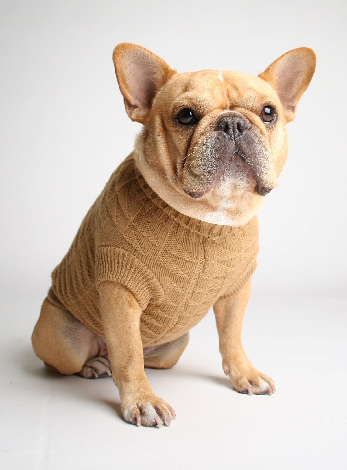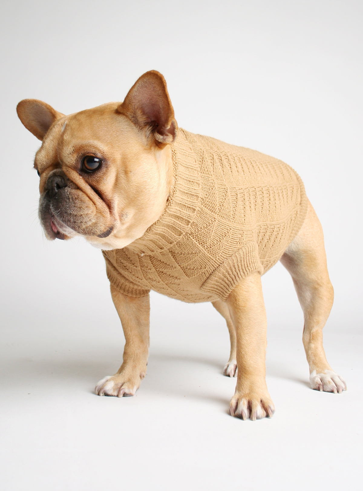 Soft hand-knit pet sweater, featuring: 100% acrylic hand-knitting. Huey (the model) has a chest measurement of 22″ and wears size XL.